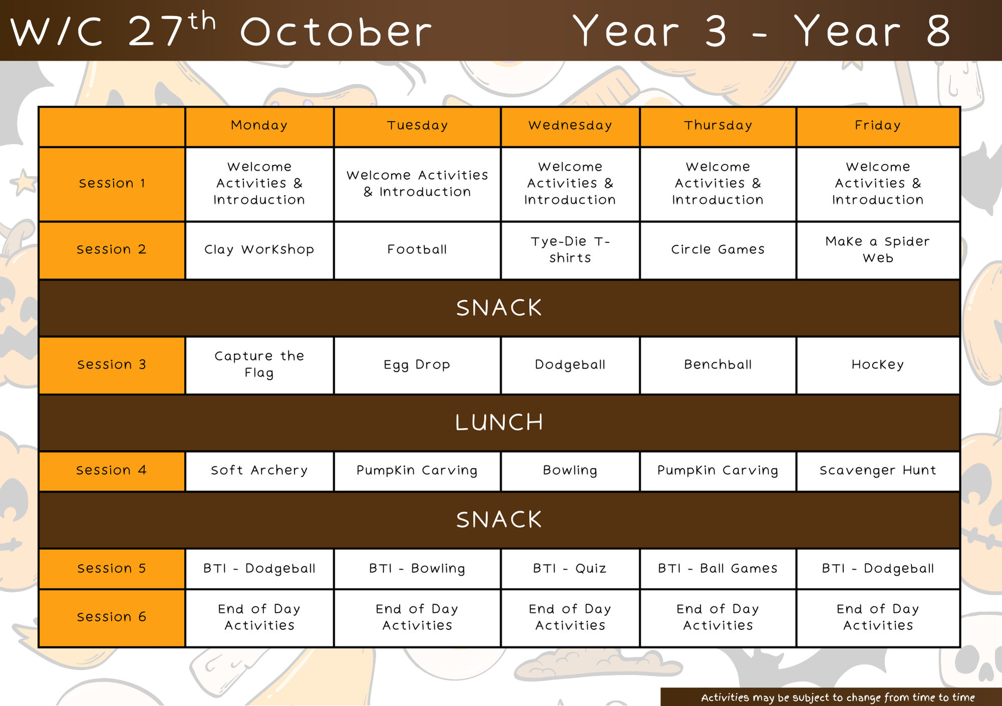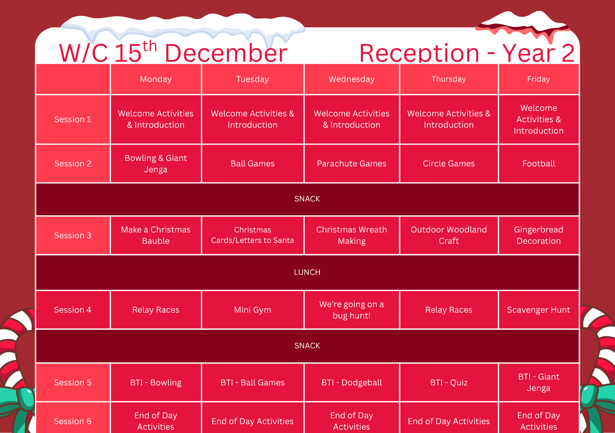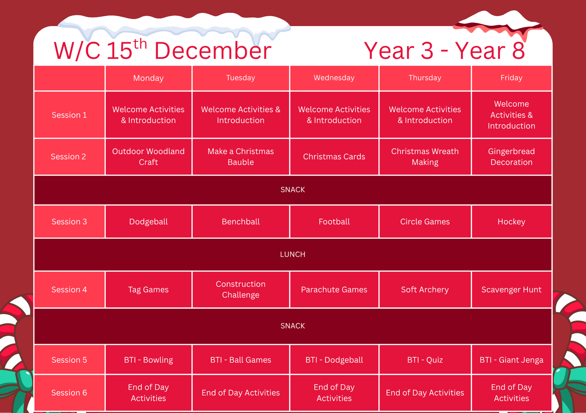 - Varied sessions (sport, team challenges, crafts, drama and more)